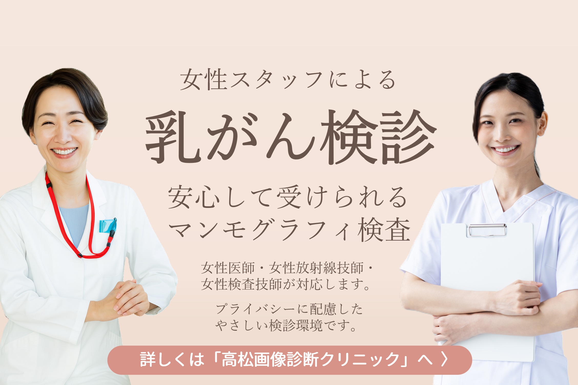 乳がん検診(マンモグラフィ検査)のお知らせ 2025/10/16 高松画像診断クリニックでは、女性医師・女性放射線技師・女性検査技師による乳がん検診(マンモグラフィ検査)を行っております。 安心して検査を受けていただける環境で、早期発見・早期治療をサポートいたします。 詳しくは、高松画像診断クリニックへお問い合わせください。
