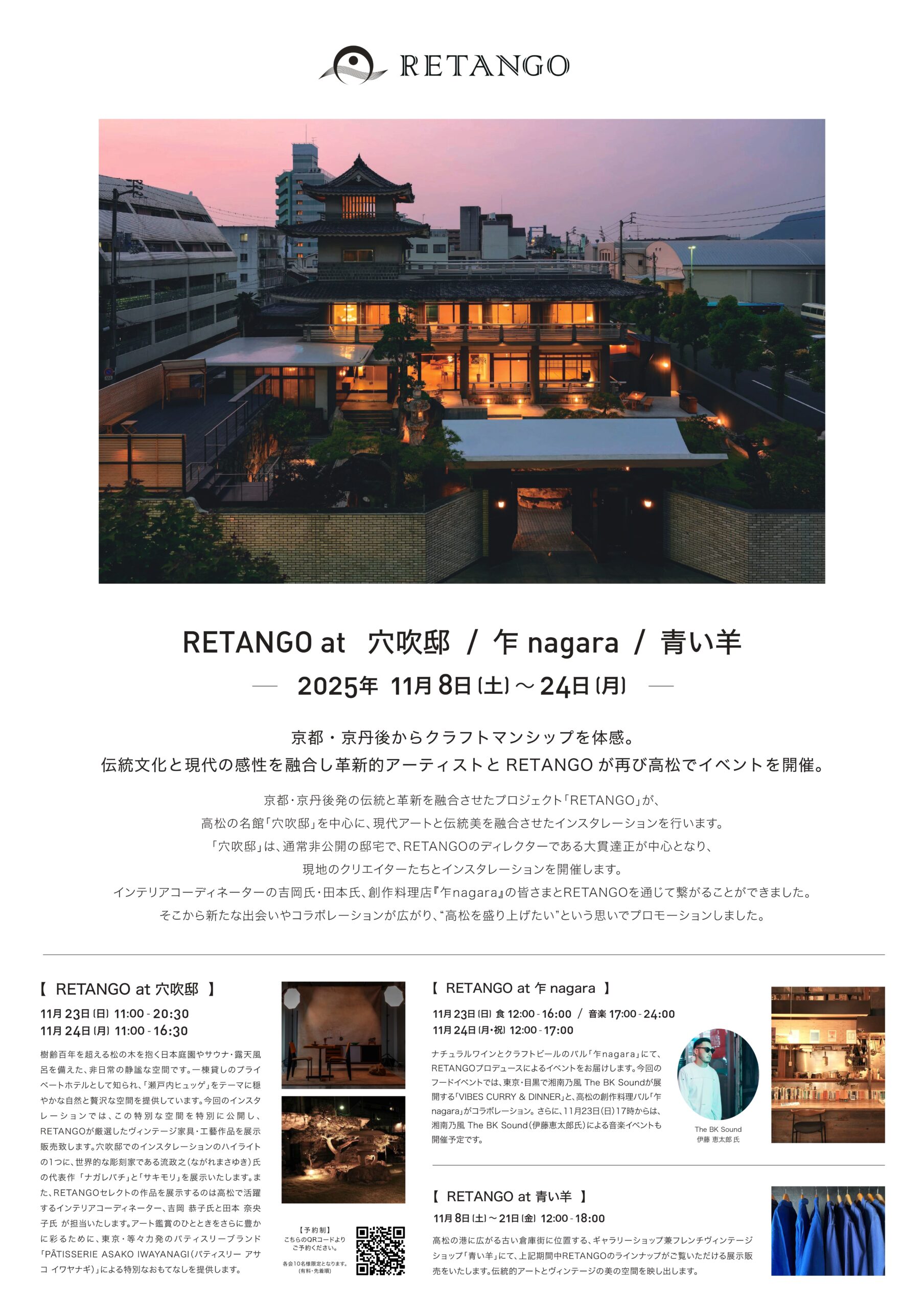 京都・京丹後発のアートプロジェクト「RETANGO」による展示イベントが、高松の歴史ある邸宅「穴吹邸」にて開催されます。
