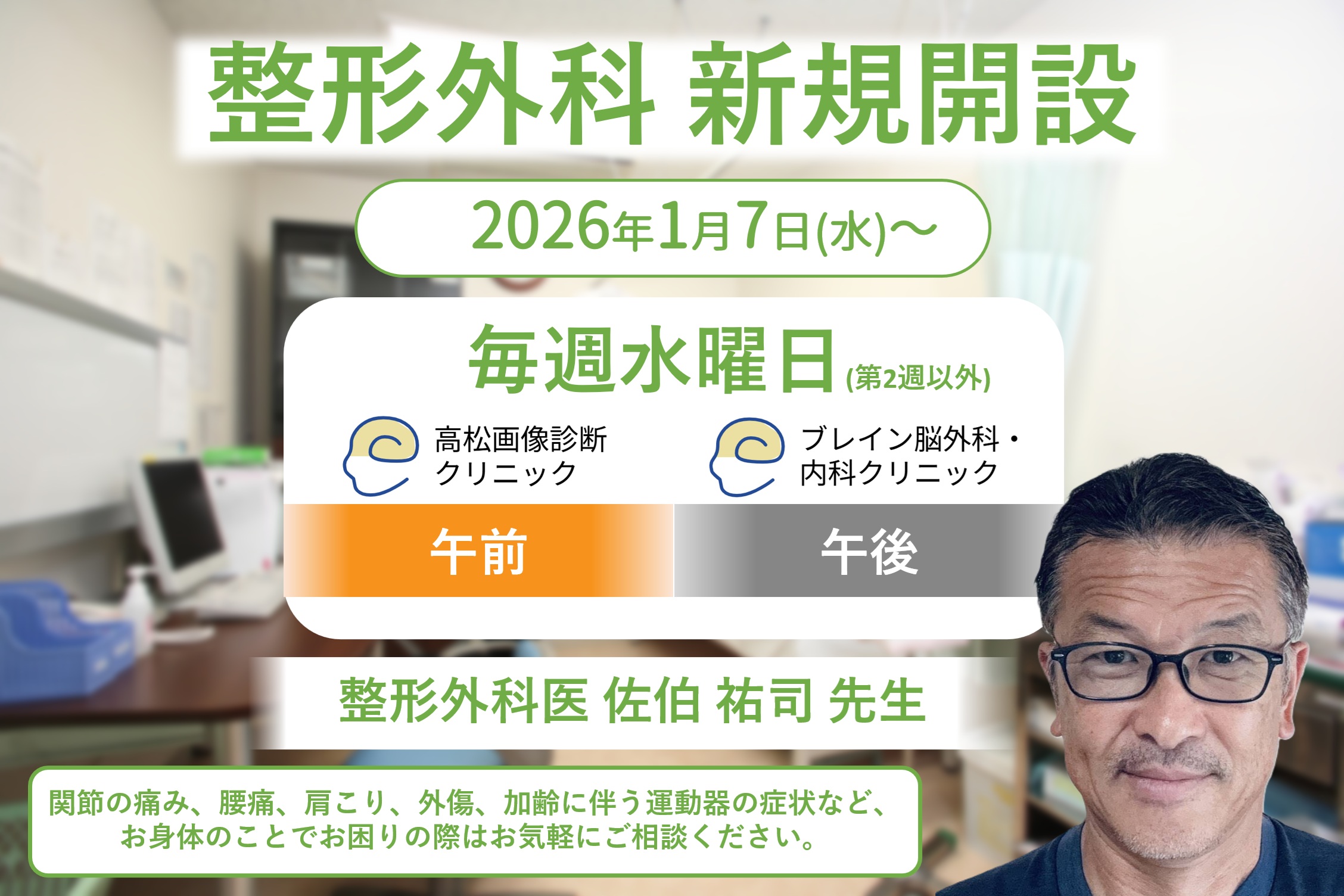 2026年1月5日より、高松画像診断クリニックおよびブレイン脳外科・内科クリニックの2施設において、新たに整形外科を開設いたしました。
