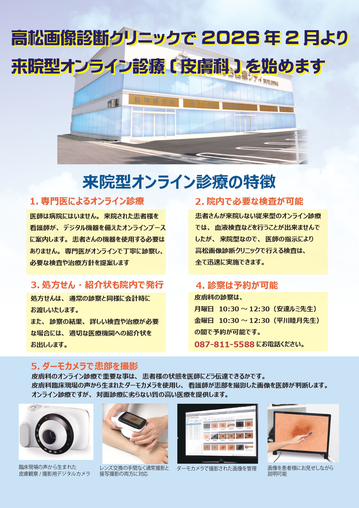 高松画像診断クリニックでは、2026年2月より「来院型オンライン診療(皮膚科)」を開始いたします。